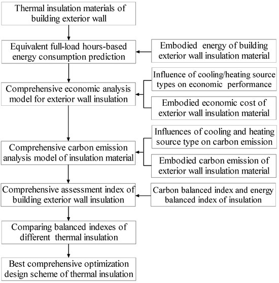 Economic, energy, and carbon reduction factors should be comprehensively considered in assessing different design schemes for exterior wall insulation. In this study, a comprehensive balanced index is proposed to evaluate different design schemes of exterior wall insulation. The comprehensive balanced index includes a carbon-balanced index () and an energy-balanced index (). The comprehensive balanced index has two main advantages. First, the optimal design scheme of external wall insulation could be determined by comparing their balanced index scores. The presented balanced index can provide a useful evaluation index of external wall insulation. Second, the presented balanced index considers the comprehensive impacts of economic, energy, and low-carbon factors on external wall insulation. The balanced index method overcomes the shortcoming in previous studies that only economic performance is considered in optimizing exterior wall insulation. The balanced index method is helpful in achieving the goals of economic rationality, energy efficiency, and carbon reduction of exterior wall insulation. The carbon-balanced index refers to the proportion of the product of additional investment capital because of exterior wall insulation and carbon emission of exterior walls without insulation to the product of investment capital of exterior walls without insulation and carbon emission reduction because of exterior wall insulation. The energy-balanced index is defined as the ratio of the product of additional investment capital because of exterior wall insulation and energy demands of exterior walls without insulation-to-the product of investment capital of exterior walls without insulation and energy demand reduction because of exterior wall insulation.