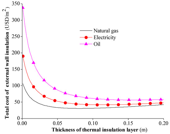 The cooling and heating source type had significant influences on the economic performance of external wall insulation in buildings. Because energy efficiency ratios and energy prices of different types of cooling and heating sources are different, the economic performance of external wall insulation is different for different types of cooling and heating sources. Electricity, oil, and natural gas are three popular types of cooling and heating sources in buildings. The indoor air temperature is maintained in summer by air conditioners with an energy efficiency ratio of 3.6. Electricity, oil, and natural gas are considered in winter to investigate the effects of the cooling and heating source type on the economic performance of external wall insulation. The air conditioner, natural gas boiler, and oil boiler were assumed to be 3.6, 0.93, and 0.85 in winter, respectively. Because EPS had the best economic performance, EPS was used as a case study in this study. Figure 5 shows the variation in the total cost of EPS for different heating and cooling source types. The maximum values of the total cost of external wall insulation occurred when the external wall had no insulation. The minimum values of the total cost of external wall insulation occurred when the insulation layer thickness was optimal. The minimum values of the total cost of external wall insulation for electricity, oil, and natural gas were 41.7 USD/m2, 56.4 USD/m2, and 30.6 USD/m2, respectively. The ranking of the total cost of external wall insulation for three types of cooling and heating sources is natural gas < electricity < oil. The optimal insulation layer thicknesses for electricity, oil, and natural gas were 0.113 m, 0.155 m, and 0.081 m, respectively. Natural gas had the best economic performance of cooling and heating source type. The largest variation in the total cost of external wall insulation for different types of cooling and heating sources (25.8 USD/m2) was higher than that (8.1 USD/m2) for different types of insulation in the building’s external walls. There are certain differences among the minimum values of total cost for different types of cooling and heating sources. Additionally, there are certain differences among the optimum insulation thicknesses for different types of cooling and heating sources. Thus, the cooling and heating source type should be considered when determining the optimum insulation layer thicknesses for a building’s external walls.