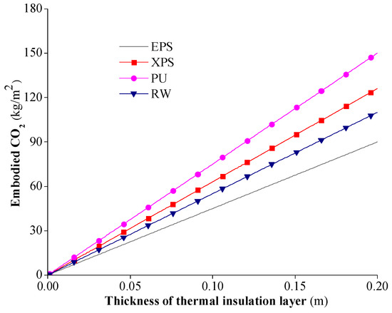 The thermal insulation of exterior walls concerns the embodied carbon emission and carbon emission due to the energy consumption of exterior walls. The carbon emission of thermal insulation of the external wall per square meter () is the sum of embodied carbon emission of thermal insulation and energy consumption cost due to the cooling and heating load of the exterior wall. can be calculated by using the following Equations: