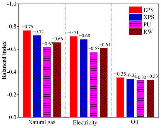 The balanced indexes of different types of insulation and different types of cooling and heating sources were determined by using Equations (22)–(24), as shown in Figure 9. The balanced indexes varied with different types of insulation and different types of cooling and heating sources. The ranking of the balanced index of insulation for the same type of cooling and heating source was EPS > XPS > RW > PU. The ranking of the balanced index of cooling and heating sources for EPS insulation was natural gas > electricity > oil. The biggest difference between the balanced indexes of insulation for the same type of cooling and heating source for different types of insulation was 0.14. The biggest difference between the balanced indexes of different cooling and heating sources for EPS insulation was 0.41. The largest variation in the balanced index for different types of insulation (0.14) was smaller than that (0.41) for different types of cooling and heating sources. The smaller the balanced index score, the better the economic performance, energy efficiency, and carbon reduction effects of external wall insulation. Thus, EPS insulation is the best solution for external walls in the concerned office building. Natural gas is the best solution for the cooling and heating source in winter for the concerned office building.