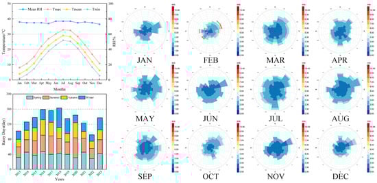 Wuhan (30.62° N, 114.30° E) is located at the eastern part of the Jianghan Plain, divided into three towns by the Yangtze River [36] and its largest tributary, the Han River. The lake area in Wuhan constitutes over 1/4 of the city’s total area, leading to an annual relative humidity exceeding 70%. Figure 1 presents the city’s typical climate. Wuhan is renowned as one of China’s “furnace cities” [37], with a summer lasting 135 days and peak temperatures approaching 40 °C, and a winter lasting 110 days with minimum temperatures dropping to −18 °C. During the hot season (June to August), wind is frequent but weak; in contrast, during the cold season (December to February), the wind is stronger but less frequent. Overall, Wuhan’s climate typifies the HSCW region, with extreme summer and winter conditions that present significant challenges to the internal environment of ESS building constructions. These distinct climate characteristics make Wuhan an ideal candidate for this study. Therefore, this research aims to carry out an exploration, with Wuhan selected as a case study.