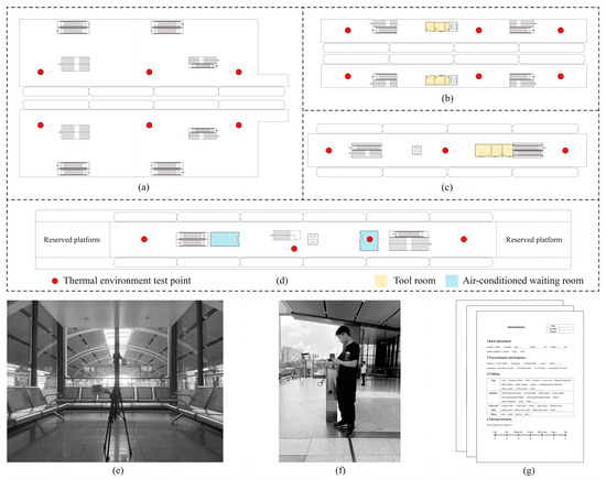 Arrangement of measurement points and test methods. (a) Platform A1 (Line 1). (b) Platform A2 (Line 1). (c) Platform A3 (Line 1). (d) Platform B1 and B2 (Line 2). (e) Fixed automatic measurement. (f) Manually measurement. (g) Questionnaire.