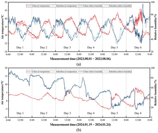Figure 3 shows the temperature and relative humidity variation curves for outdoor monitoring points in urban and suburban areas. The outdoor measurements were compared with historical meteorological data, confirming that these periods are representative of the typical summer and winter climates in Wuhan. Rain began on the afternoon of August 6, and the rest of the summer measurement period was sunny. In Wuhan’s summer, humidity is higher at night and lower during the day, with the highest air temperature typically occurring around 2 PM. In winter, continuous precipitation from 19 to 21 January increased relative humidity, but the arrival of cold air from 22 to 24 January caused relative humidity to drop below 20%.