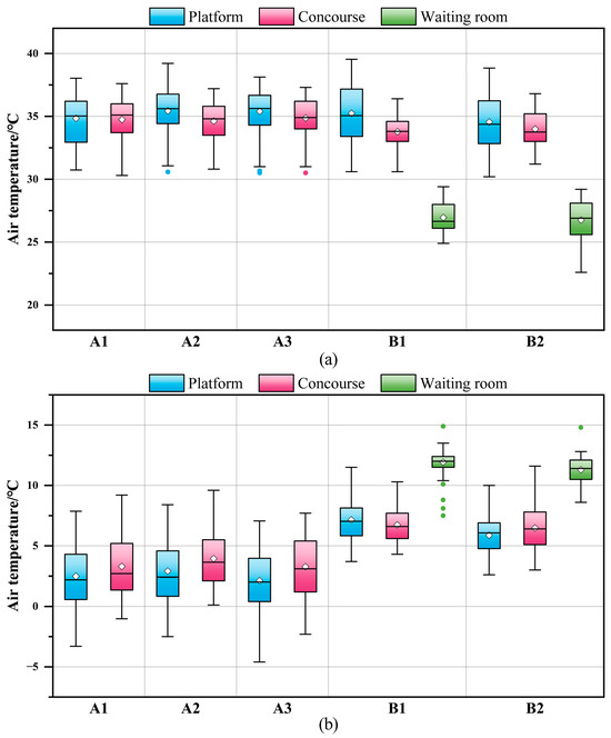 Box plot of air temperature in elevated subway stations. (a) Summer. (b) Winter.