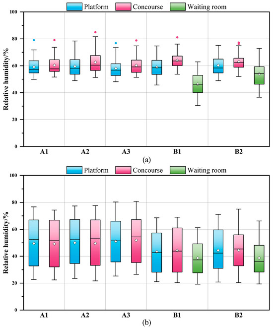 Box plot of relative humidity in elevated subway stations. (a) Summer. (b) Winter.