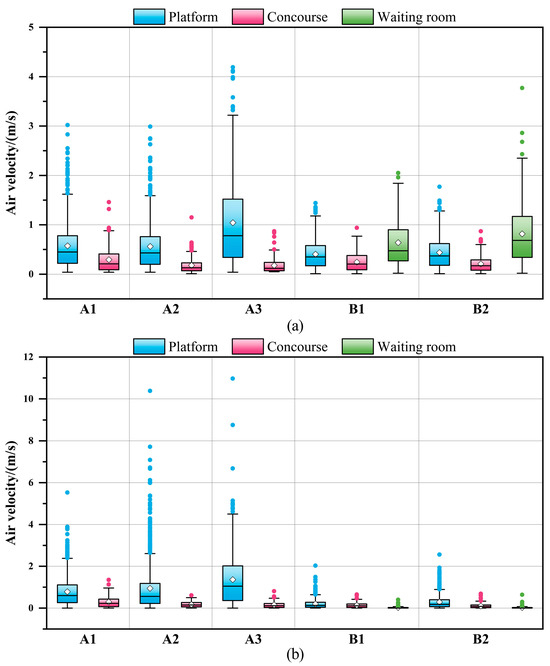 Box plot of air velocity in elevated subway stations. (a) Summer. (b) Winter.