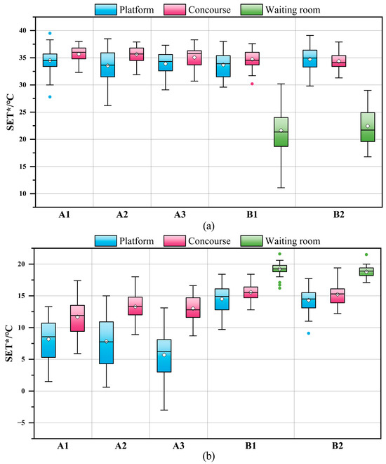 Box plot of SET* in elevated subway stations. (a) Summer. (b) Winter.