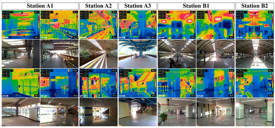 Field measurements were conducted simultaneously in the five stations during the main subway usage periods, from 8:00 to 18:00, on 1–6 August 2023, and 19–24 January 2024. A summary of the measurement instruments and their parameters is provided in Table 3. The environmental parameters measured included air temperature (Ta), relative humidity (RH), air velocity (Va), globe temperature (Tg), illuminance (lx), and wall temperature. Prior to the experiment, all instruments were standardized and calibrated to ensure the accuracy of the data obtained. The temperature and humidity data logger and globe temperature recorder measured data at one-minute intervals, continuously and automatically throughout the entire testing period. The hot wire anemometer was operated manually on the platform when no trains were present to avoid the influence of train-induced airflow. The placement of measuring instruments was carefully arranged to avoid direct sunlight and ventilation outlets, with a distance of more than 1.2 m from the track area.