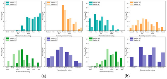 The questionnaires were administered with the measured data collection periods. Prior to the survey, a thermal comfort questionnaire and a seven-point thermal sensation scale were developed based on the standards set forth in ASHRAE Standard 55-2013 [26,39] and the Evaluation standard for indoor thermal environment in Civil Buildings (GB/T 50785—2012) [40]. A four-level thermal comfort scale, ranging from “comfortable” to “terrible”, was also established (Table 4). Prior to completing the questionnaire, participants were informed of the research purpose, and informed consent was obtained. To achieve greater differentiation in the questionnaire results, pre-surveys and measurements were carried out at the target stations. Finally, two stations with the most pronounced differences were chosen for the questionnaire: Station A3, which is fully open and small in scale, and Station B1, which is fully enclosed and large in scale.