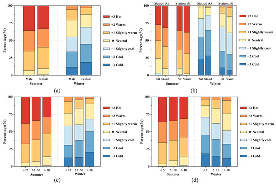 A total of 1377 valid responses were collected, including 718 in the summer and 659 in the winter. Given the multitude of scenarios that passengers encounter during the transition process, including climbing stairs, security checks, ticket validation, and elevators, their thermal sensation and metabolic rates undergo dynamic changes. To ensure the accuracy of the thermal sensation data, only passengers who remained on the platform for a minimum of one minute were surveyed. The number of questionnaires distributed during each time period was determined based on the fluctuations in the physical environment and ridership. Once the requisite number of responses for a specific period was obtained, the survey was immediately concluded and resumed at the beginning of the subsequent time period.