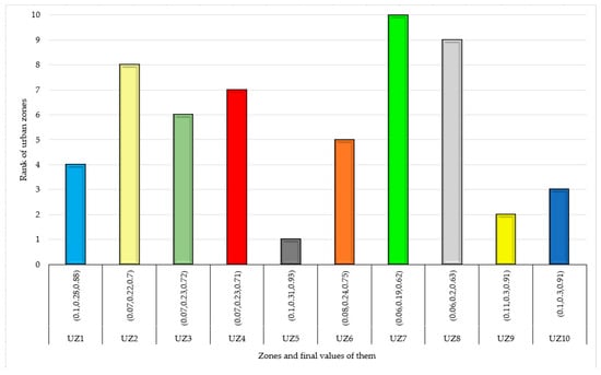 In the second step of the Fuzzy OPARA method, the calculation of all parameters required for the proper normalization process was carried out, which involves three steps described in the methodology. In the third step, normalization was performed, which depends on the type of criteria. It is necessary to note that, in this study, all criteria were modeled as benefit criteria. By applying the remaining steps of the Fuzzy OPARA method, the final results for urban zones were obtained and are presented in Figure 4.
