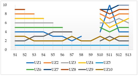 The first step in this section of the paper is the evaluation of all 10 potential urban zones by experts, where each location is assigned a certain linguistic variable based on the given criterion. This variable is later transformed into TFNs. Below, in Table 2, an example of the evaluation of urban zones by the first expert is shown.