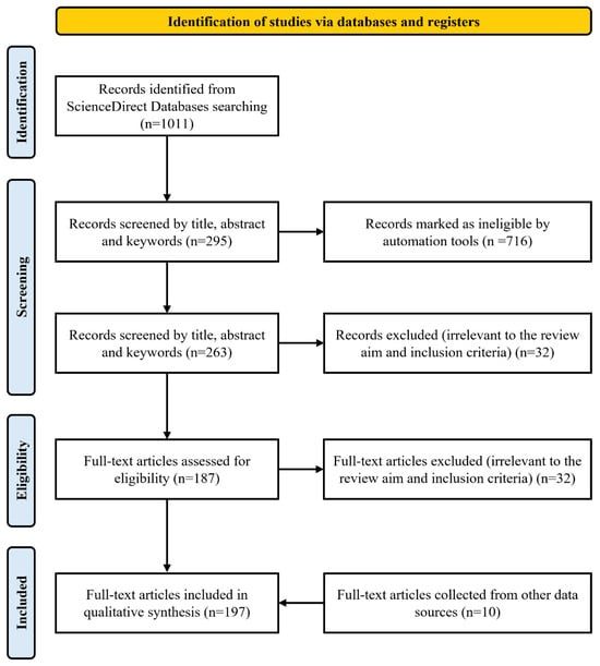 After retrieving 1011 records from the ScienceDirect database, this study followed the PRISMA methodology for the subsequent steps of screening, eligibility assessment, and inclusion. As shown in Figure 1, the first step involved screening titles, keywords, and abstracts, ensuring that the selected records contained keywords such as “school architecture” OR “educational building” OR “school house” OR “school building” OR “school facility” OR “school-houses” AND “thermal”. The Boolean operators “AND” and “OR” were also applied. This initial screening resulted in 295 eligible articles.
