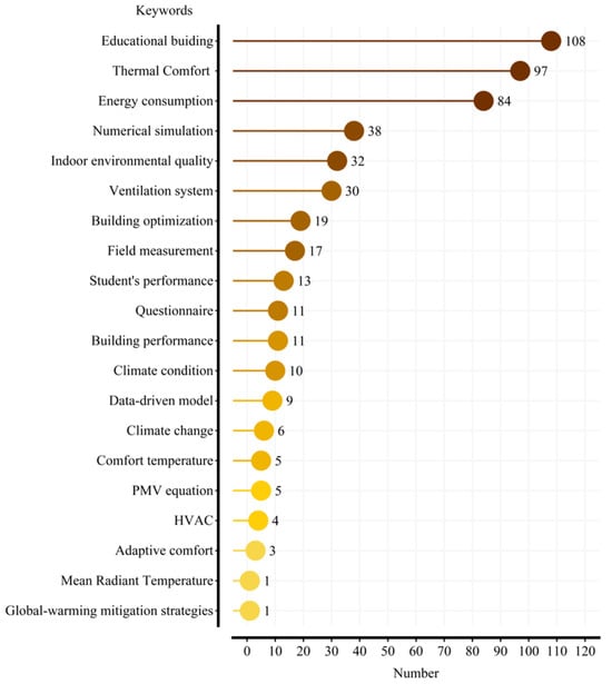 High-frequency keywords: Among the 194 articles reviewed, “educational buildings” (41%), “thermal comfort” (36%), “energy consumption” (32%), and “numerical simulation” (13%) were the most common keywords.