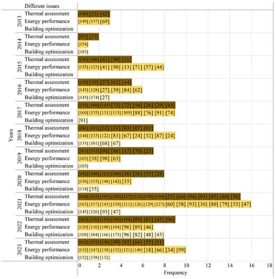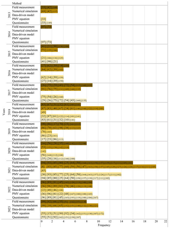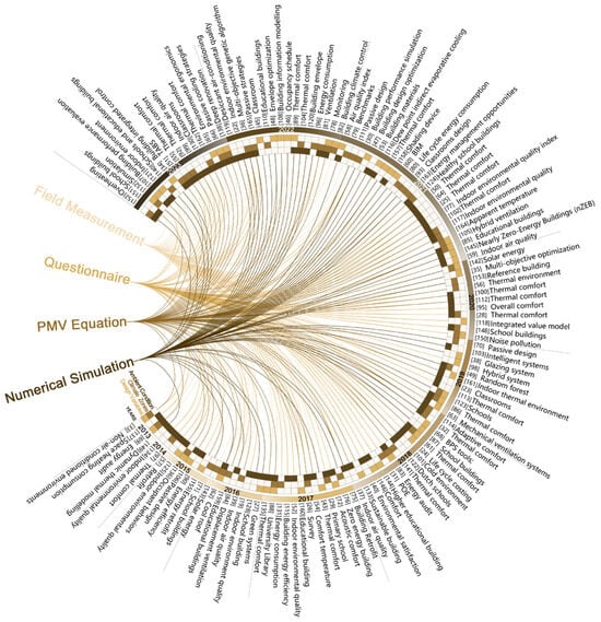 Moreover, a bibliometric analysis by publication year demonstrates a steady increase in research on the indoor thermal environment of educational buildings from 2013 to 2023, peaking in 2021. This surge may be attributed to the widespread adoption of high-performance thermal environment simulation platforms after 2014, which significantly reduced the entry barriers for research methods such as numerical simulation, thereby encouraging a greater number of researchers to engage in this field.