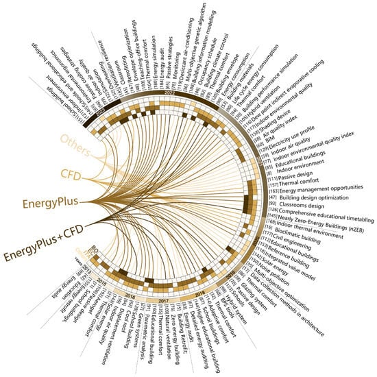 Figure 4 presents the distribution of research topics associated with various simulation tools, including EnergyPlus, CFD, their combination (EnergyPlus + CFD), and other modeling approaches. The figure highlights EnergyPlus’s dominance in energy consumption research, while CFD is primarily utilized for airflow and ventilation studies. In studies encompassing multiple research domains and complex multi-variable analyses, researchers frequently integrate EnergyPlus and CFD to address research challenges [96,145]. Additionally, indoor thermal assessment and energy consumption emerge as the two most extensively studied research areas, as illustrated in Figure 4. Studies on indoor thermal assessment predominantly focus on evaluating thermal comfort, ventilation performance, and adaptive strategies, whereas energy consumption research emphasizes HVAC efficiency, energy-saving strategies, and sustainable building design. This distinction underscores the dual focus in thermal environment research—striking a balance between optimizing indoor comfort and reducing building energy consumption.