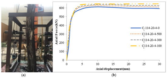 Figure 4 illustrates the overall buckling failures of CFT columns with a tie bar spacing of 500 mm. The ultimate load of the C1114-20-4-0 column was recorded as 611 kN, as shown in Figure 6b. Due to the ability of the normal-strength concrete columns to maintain ductility beyond the peak load in Figure 6b, the load–displacement curve of this column exhibits no strength loss, indicating a high deformation capacity of the concrete core under confinement. In comparison to a simple CFT column, the C1114-20-4-500 column achieved a compression load capacity of 626 kN, reflecting a 3% increase. These results show that tie bars spacing had a minimal effect on the confinement performance and load-bearing capacity.