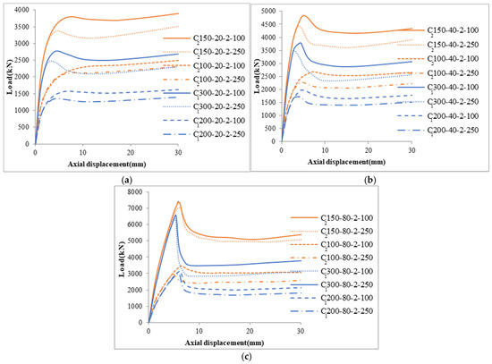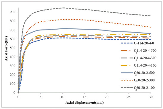 Also, a higher load capacity value was recorded at the peak compression load level for the four-cell CFT columns with a 100 mm spacing compared to the 300 and 500 mm spacing columns with the same tube thickness and concrete strength (Figure 8a,b). The load-bearing capacity of the C260-20-2-100 column was about 964 kN and increased by about 15.6% and 33% compared to the four-cell CFT columns with tie bars of 300 and 500 mm spacing, showing the significant effect of the tie bar spacing on the confinement of four-cell composite columns.