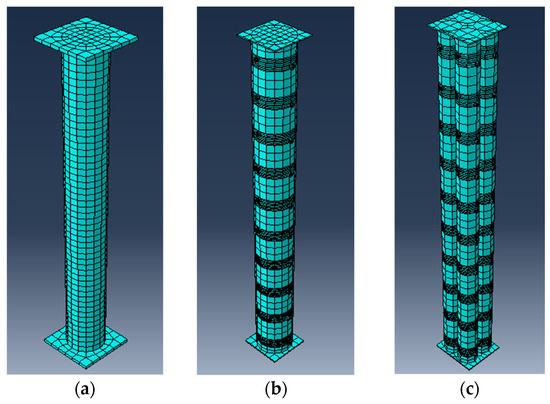 Mesh types used in numerical modeling. (a) Simple CFT model without tie bars, (b) simple CFT model with tie bars with a 100 mm spacing, (c) four-cell CFT model with tie bars with a 100 mm spacing.