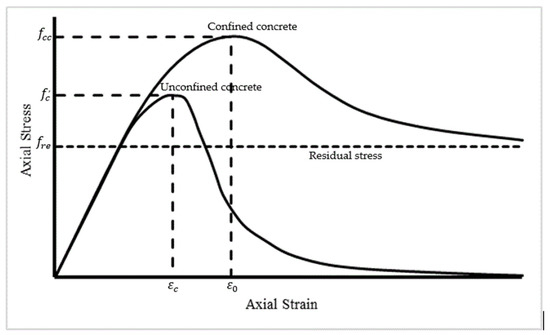 In Figure 14, the compressive strength and its corresponding strain in unconfined concrete are represented by and , respectively. The compressive strength and strain of the confined concrete, respectively, are also represented by and . Furthermore, the confined concrete’s residual stress is . Equation (1), presented by Lim et al., was used to calculate the strain corresponding to the stress in unconfined concrete [53].