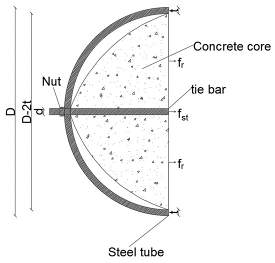 where D is the steel tube’s outer diameter, L is the column’s total height, t is the steel tube’s thickness, d is the tie bars’ thickness, and , , and are the steel tube’s stress, strain, and elastic modulus, respectively. The number of tie bars is n, and the steel tube’s yield stress is .