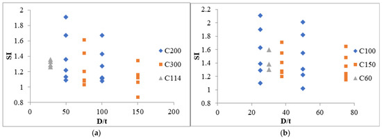 Figure 25a illustrates the ductility of CFT columns with varying thicknesses and cross-sections. The DI value for C300 showed the highest ductility among the simple CFT columns. Furthermore, as depicted in Figure 25a, the DI values for C300, C200, and C114 increased by approximately 1.7, 1.28, and 0.98, respectively, due to the thinner steel tubes and larger cross-sections.