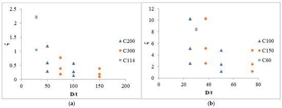 Ductility index of the CFT columns with different D/t ratios. (a) Simple CFT columns, (b) four-cell CFT columns.