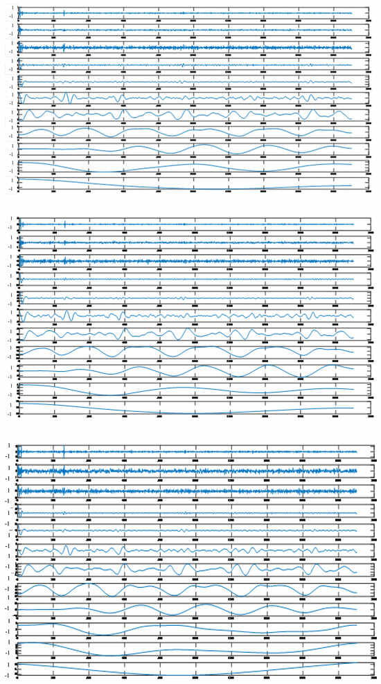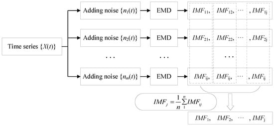 23]. Huang et al. believe that any original signal is composed of several overlapping eigenmode functions. In essence, EMD stabilizes the signal to obtain a series of IMFs with a gradually stable frequency and a margin B. However, when the time scale of the signal has a jump change, IMFs will contain different time-scale feature components, and EMD itself has the disadvantage of being prone to modal confusion. For these situations, Huang and Wu proposed the EEMD model. By adding white noise to the signal to be decomposed, EEMD utilizes the uniform distribution of the white noise spectrum to make the original signal spread over the white noise background with a uniform distribution in the entire time–frequency space, and the signals of different time scales will be automatically distributed on the appropriate reference scale, making the signals have continuity at different scales, thus achieving the purpose of suppressing mode confusion. Since the mean value of white noise is zero, after adding white noise several times and obtaining the average value, the additional noise is eliminated, and the result is the signal itself.