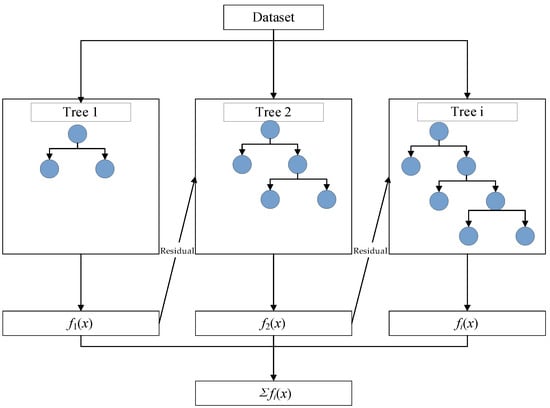 28] is an extension of the GBM algorithm and a prediction model with both linear regression and regression tree characteristics. In the XGBoost algorithm, there are multiple tree structures, each of which contains multiple branches (decision trees). The generation of each decision tree is adjusted according to the prediction results of the previous decision tree. Taking into account the prediction bias of the previous decision tree, we can gradually correct the prediction results. Each decision tree is generated by taking into account the entire dataset to optimize the model on the largest scale (