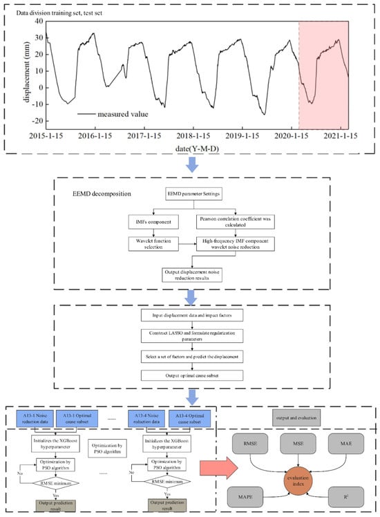 As an important water retaining structure in water conservancy projects, a dam has the characteristic of raising the water level. By 2020, China will have 4872 large- and medium-sized reservoirs with a total storage capacity of 858.9 billion cubic meters. Dam displacement can effectively reflect their operating state and is an important index of dam safety structure health monitoring. It is of great significance to establish an accurate and reliable displacement prediction model for dam health monitoring. Based on the above-mentioned philosophical thinking on contradiction theory, practice theory, epistemology, and system theory and aiming at problems such as the low prediction accuracy of the current analysis model and the insufficient depth of data mining, this paper proposes a dam displacement analysis and prediction model. By using variational mode decomposition of the original deformation sequence data to obtain the components in different frequency domains, an EEMD–wavelet data denoising model was established, and a nonlinear intelligent optimization algorithm was adopted considering the spatio-temporal correlation of multiple measurement points. A spatio-temporal prediction model based on the EEMD–wavelet model was proposed. The accuracy and precision of the prediction model are improved under this prediction model.