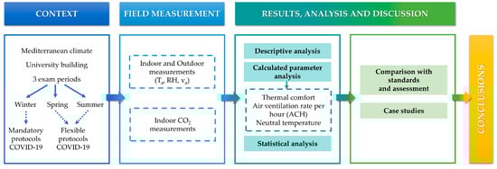 In this research, we have analysed how the mandatory ventilation measures during the pandemic and their subsequent relaxation in the post-pandemic period have affected the environmental conditions in universities throughout different seasons of the year. For this, after conducting different measurement campaigns, parameters regarding IAQ and thermal comfort were calculated and statistically analysed. Then, the results obtained were compared with the standards and case studies were developed to evaluate the evolution of the most significant variables over time. Finally, the main conclusions were drawn, the study limitations were identified, and lines of future research were proposed. The methodology followed is presented in Figure 1.