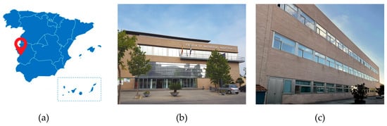 A technical college located in southwestern Spain (38°53′2.5″–7°0′11″), an area with a Mediterranean climate (Csa) [45], was selected for this research. Winter is usually mild, with temperatures rarely below 6 °C. In summer, maximum temperatures are around 35 °C, with episodes of extreme heat reaching 41–42 °C.