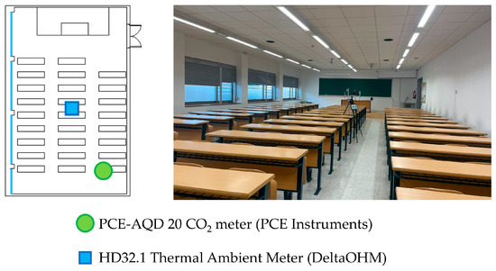 Environmental parameters and ventilation conditions were monitored at one-minute intervals during the examinations. The CO2 meter, model PCE-AQD 20 (PCE Instruments, Albacete, Spain), was placed at the back of the classrooms, 1.50 m from the walls and 1 m from the breathing zone of the individuals [56]. The thermal environment equipment was placed in the centre of the rooms to provide a representative assessment of the microclimate during testing. Both devices were turned on 15 min before student entry to ensure stable measurements. A representation of the classroom layout and the location of the equipment is shown in Figure 3.