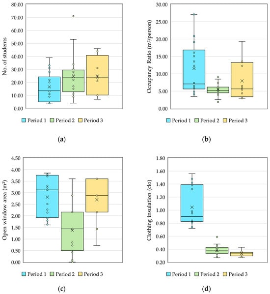 (a) No. of students, (b) Average occupancy density in m2/person and (c) Average window opening in m2, (d) Clothing insulation in clo, per period.