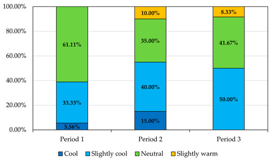 In Periods 2 and 3, although with milder weather conditions and the possibility to adjust ventilation measures, the predominant thermal sensation was “slightly cool” (40.00% and 50.00%, respectively). This contrasts with previous research that has observed a majority feeling between “slightly warm” and “hot” in this climate [84,86,87]. However, in some studies in air-conditioned classrooms, the calculated PMV is in the thermal neutrality zone, although with an inclination towards the “slightly cool” category [53,88].