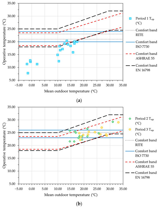 Practically all tests carried out in winter conditions (Figure 8a) were below the lower comfort limits. In this climatic scenario, RITE could be considered the most restrictive standard [63], as none of the tests met its thermal comfort range. In contrast, EN 16798-1:2020 had a wider comfort range, with 4 of the 18 tests (22.22%) performed in Period 1 falling within its limits [64]. These findings are consistent with previous studies conducted in educational buildings under the same conditions. For example, in the research carried out by Campano et al., operative temperatures around 19.50 °C were observed with outdoor temperatures close to 10.00 °C, both in heated and unheated classrooms. This could suggest that heating classrooms in these pandemic conditions would not have a sufficient effect [84]. In contrast, in mechanically ventilated classrooms, Ding et al. found no evidence of discomfort conditions as prescribed by the regulations consulted in their case [38]. On the other hand, Alonso et al. detected a discomfort rate in 99.00% of the tests, as indoor temperatures did not reach the lower comfort limits. At the same time, the same study also evaluated the environmental conditions in the classrooms before COVID-19. In this case, a large percentage of discomfort was experienced because the upper temperature limits were exceeded in many cases due to heating use [77].