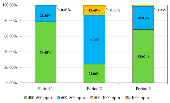 At the same time, the variability in values was significantly higher in Period 2 (between 440.00 and 1042.00 ppm), at times even exceeding 1000 ppm. These results would be consistent with the smaller area of open windows and higher classroom occupancy. During Period 3, CO2 concentrations decreased compared to the previous period, ranging from 444.00 to 974.00 ppm. Although the average number of students remained the same, an increase in window openings was observed, possibly due to the slightly higher temperatures. In work carried out without the mandatory ventilation measures, higher CO2 levels were observed than those obtained for these two study periods. For example, in rooms where windows were closed during monitoring, CO2 concentration ranged between 1000 and 2000 ppm most of the time, as reported by Krawczyk et al. [75], Campano et al. [108], and Madureira et al. [109].