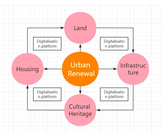The system of urban regeneration covers all the physical elements in the city, including topography, water bodies, buildings, transport networks, etc., which together form the physical framework of the city. As shown in the following Figure 4. The social subsystem, on the other hand, focuses on the residents in the city, who are the beneficiaries of urban renewal and the main body of urban life. Building a unified information-based digital assistance platform between these two subsystems is a key step towards sustainable urban regeneration. Such a platform not only facilitates the flow and sharing of information but also improves the transparency of decision-making and public participation [12]. This platform not only offers the possibility of integrating urban planning and social systems but also provides technical support and a database for the implementation of sustainable urban regeneration [31].