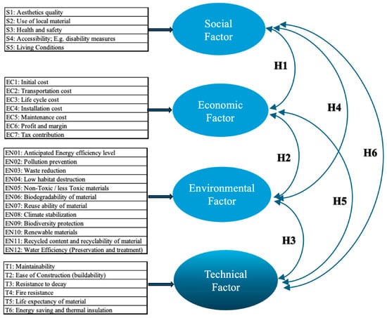 According to the aforementioned explanations, the factors influencing the selection of SCMs can be categorized as social, economic, environmental, and technical factors, as shown in Figure 2. These hypotheses suggest direct relationships, indicating that improvements in one factor correlate with improvements in the related factor, as detailed next: