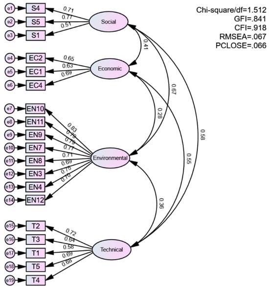 In CFA, the primary purpose of hypothesis testing regarding relationships between variables is to validate the measurement model by examining the empirical data. The structural equation model (SEM) presented in Figure 3 evaluated the relationships among four latent constructs—social, economic, environmental, and technical factors—as measured by their respective observed variables. The model demonstrated an acceptable fit to the data, as indicated by several fit indices: chi-square/df = 1.512 (below the threshold of 3, suggesting a good fit []), CFI = 0.918 (exceeding the recommended minimum of 0.90 for model acceptability []), and RMSEA = 0.067, with PCLOSE = 0.066 (within the acceptable range of ≤0.08, indicating a reasonable approximation of the population []). Although the goodness-of-fit index (GFI = 0.841) is slightly below the preferred threshold of 0.90, it remains acceptable in exploratory research contexts or the sample size is small []. The factor loadings, predominantly above 0.5, indicate strong and meaningful relationships between the latent constructs and their respective indicators, supporting construct validity []. Additionally, the moderate correlations among the latent variables suggest a balanced interdependence, avoiding excessive multicollinearity. Thus, the SEM analysis provides a robust framework for exploring the interrelationships among the constructs, contributing to the understanding of multidimensional influences in this research context.