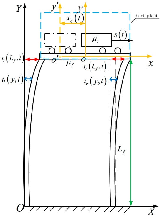 The plan presented in Figure 1 depicts a single-story-tall building system. This system is composed of two flexible walls, which are interconnected by a rigid floor. An active mass damper in the form of a trolley moves on this rigid floor. This model is studied with reference to Quanser’s flexible building platform. To simplify this complex scenario, the left and right walls are modeled as two Euler–Bernoulli beams. Here, represents the story height. is the rotor moment of inertia of the damper. denotes the mass of the rigid floor, and is the mass of the damper. For a given time t, and are the elastic deflections of the floor walls at t time and y position, respectively. and are the elastic deflections of the left and right walls, respectively, at the position y. As the tops of the walls are linked by a rigid plate, the vibrations at the top of the left-hand wall and the right-hand wall are the same. In other words, we have . The flexural rigidity of the flexible wall is denoted by , and represents the uniform mass per unit length of the flexible wall. serves as the input for active boundary vibration control, while indicates the position of the active mass damper within the xoy coordinate system.