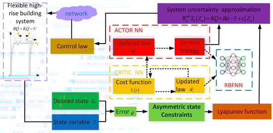 The actor–critic algorithm is used to design a reinforcement learning strategy to achieve high-rise building vibration control. For the control structure block diagram of the flexible high-rise building system in Figure 2, the whole control process can be clearly presented as follows: Firstly, the flexible high-rise building system is used as the control object, and the control law is generated through the network, which is the starting point of the whole control process. Subsequently, the actor NN starts to work, generates the update law, and determines the control strategy based on this update law. At the same time, the critic NN calculates the cost function, which leads to the update value and provides an evaluation basis for the system control. The RBF neural network is also involved, interacting with the outputs of the actor NN and the critic NN to assist in the system control. In terms of state processing, the desired state is set, which is compared to the actual state variables of the system and the error is calculated. At this point, the system needs to analyze and respond to possible failure scenarios, taking into account the potential factor of actuator failure. At the same time, asymmetric constraints come into play to limit the system state and ensure that the system operates within a reasonable range of states. After that, the stability of the system is analyzed in depth using the Lyapunov function to determine whether the system can operate stably. Finally, the system uncertainty is approximated, and the control strategy is further optimized based on the calculations and analyses in the previous sections, so that the flexible high-rise building system can reach the desired state as much as possible and achieve stable and reliable operation.