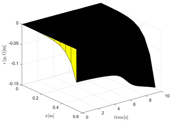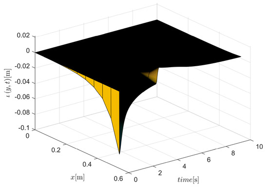 Figure 3 shows the three-dimensional vibration deformation curve of the flexible wall under uncontrolled action. In the above figure, the x axis represents the height of the flexible wall, the y axis represents the simulation time, and the z axis represents the change in the vibration of the flexible wall. It can be seen from the figure that the vibration deformation of the single-story building system cannot converge to 0 without control. Figure 4 shows the three-dimensional vibration deformation curve of the flexible wall under the action of the proposed controller (46). Similarly to the above described without control, the x axis, y axis and z axis represent the height of the flexible wall, simulation time and vibration change in the flexible wall, respectively. It can be seen from Figure 4 that sudden failure occurs at 3 s, the vibration of the flexible wall tends to be stable at 5 s, and the vibration is effectively suppressed.