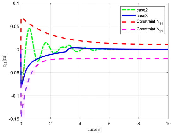 Case 3. With proposed control (46). Control parameters are selected as follows: , , . Asymmetric time-varying state constraints, , , , , , . The learning rate of reinforcement learning is , .