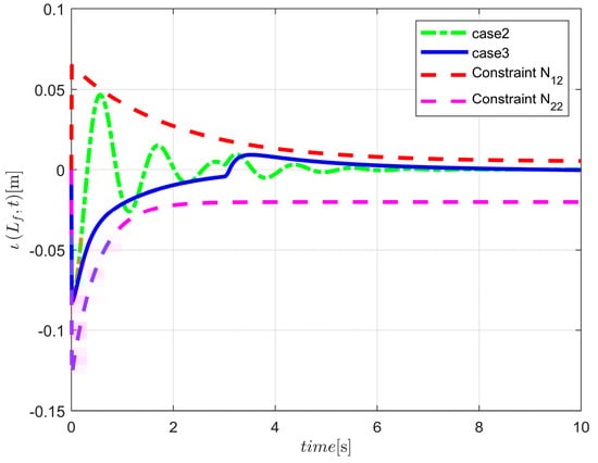 From the comparison curves in Figure 5 and Figure 6, it can be seen that under the same initial conditions, both the floor slab vibration and the tracking error of the active mass damper are effectively suppressed and tracked within 5 s when the proposed controller (Case 3) is employed. Specifically, the proposed controller is able to rapidly reduce the vibration amplitude of the floor slab and maintain a small tracking error, which indicates its strong performance in dynamic control. In contrast, although the PD control scheme (Case 2) is also able to suppress the vibration, the effect is obviously inferior to that of the proposed controller, especially in terms of the accuracy and response speed. When a sudden time-varying fault occurs in the system at the moment t = 3, the proposed control scheme is able to cope with the fault more efficiently, keeping the vibration and error low, whereas the PD control scheme fails to deal with such a sudden change well, resulting in a poorer performance of the system. This phenomenon indicates that the proposed control scheme is more robust and adaptive in coping with time-varying faults.