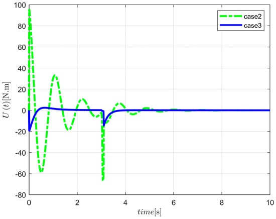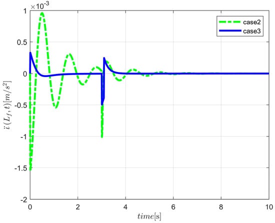 Figure 7 demonstrates the comparison of the vibration acceleration of the floor slab, which further validates the advantage of the proposed control scheme in suppressing the vibration acceleration. By comparing with the PD control scheme, it is found that the proposed controller can not only effectively suppress the vibration amplitude of the floor slab, but can also significantly reduce the vibration acceleration to avoid structural damage caused by excessive acceleration. Finally, Figure 8 shows the torque comparison curves under the control of Case 2 and 3. From the figure, it can be seen that after a sudden time-varying fault occurs at the moment t = 3, the proposed controller is able to effectively compensate for the impact of the fault through fault-tolerant control to ensure the stable operation of the system, while the PD control scheme fails to provide a similar fault-tolerant function, resulting in unstable torque changes. Therefore, the proposed control scheme shows better performance in vibration suppression, acceleration control and fault tolerance, and is more adaptable to maintaining system stability and safety under complex and sudden fault conditions.