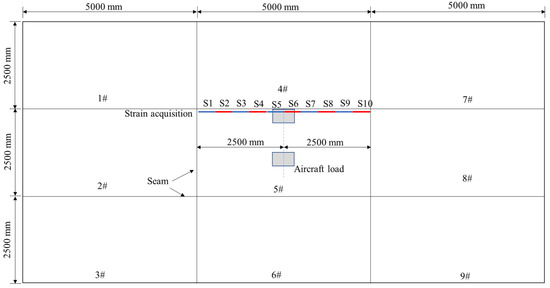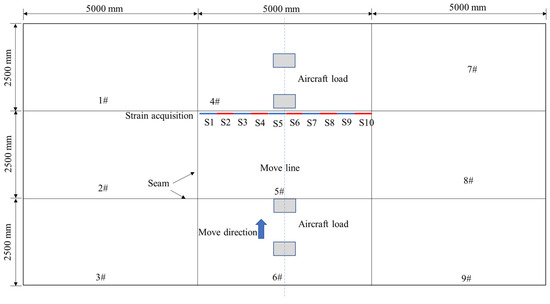 Moreover, to implement the proposed method, the strain was acquired along the length of the 5th panel, as shown in Figure 2. The strain here means the average strain within the 500 mm length of the panel, which is considered more accurate than the traditional point strain for representing the structural performance of concrete structures. In fact, long-gauge fiber Bragg grating (FBG) sensors can implement the measurement of averaged strain with a gauge from 100 mm to 1000 mm [22,23]. The strain location here is the location where the maximum strain often happens. In fact, one or more strain sensors were installed to obtain the strain response under aircraft loads. However, the model should include all the locations in the training process to implement the parameter assessment for the actual needs.