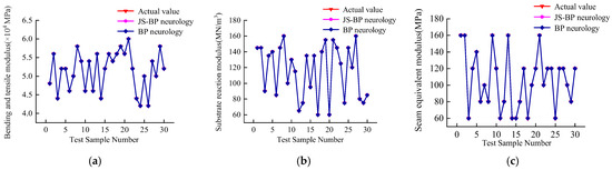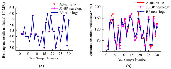 The size of the test set was chosen to ensure a robust evaluation of the model’s generalization performance while maintaining enough data for training. For each of the three parameters, about 20% of the database, about 1000 samples, was selected as the test set, while the remaining samples were used as the training set. For having a clear look at the variation of the results, 30 of 1000 results were randomly taken to draw in the figures. This split was determined based on a trade-off between model training stability and reliable performance evaluation. The parameter database was then imported into the BP and JS-BP neural network models for training to develop a prediction model for the prefabricated pavement parameters.