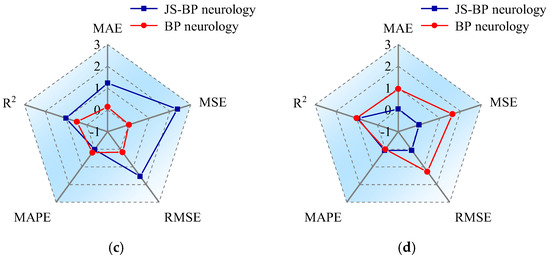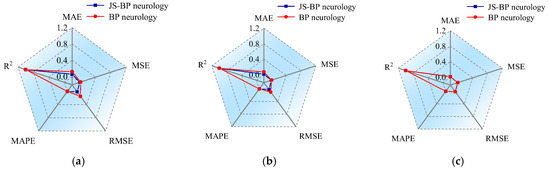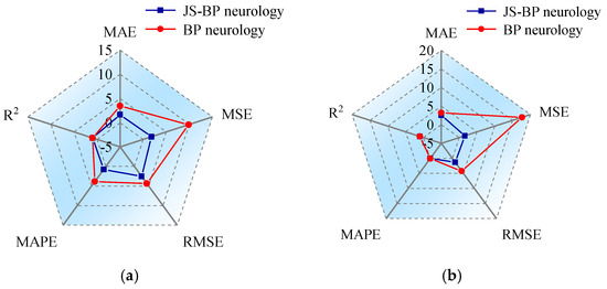 The values of the evaluation indexes are also calculated, as shown in Figure 5. In the figures, the values of the coefficient of determination R2 from the two neural network models are close to each other, greater than 0.99, indicating a very small deviation between the actual value and the predicted value. For the other four indexes, the values obtained from the JS-BP neural network model are smaller than those from the BP neural network model, which means that the JS-BP neural network model has a better prediction effect than the BP neural network model.