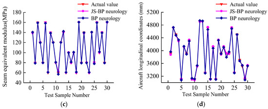 JS-BP and BP neural network model prediction results: (a) Bending and tensile modulus, (b) reaction modulus at top of the subgrade, (c) seam equivalent modulus, and (d) position of aircraft load in longitudinal coordinates.